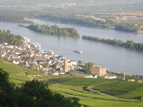 | Ein Blick auf Rüdesheim am Rhein vom Niederwald-Denkmal. Mit einer Sesselbahn besteht die Möglichkeit zum Denkmal hochzufahren. Von hier hat man einen wunderschönen Ausblick auf Rüdesheim und Umgebung . |