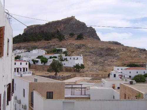 | Die Festung Lindos auf Rhodos. Blick auf die Reste des antiken Theater's. Die weisse Stadt hat viele verträumte Winkel, man könnte den ganzen Tag hier bummeln. |